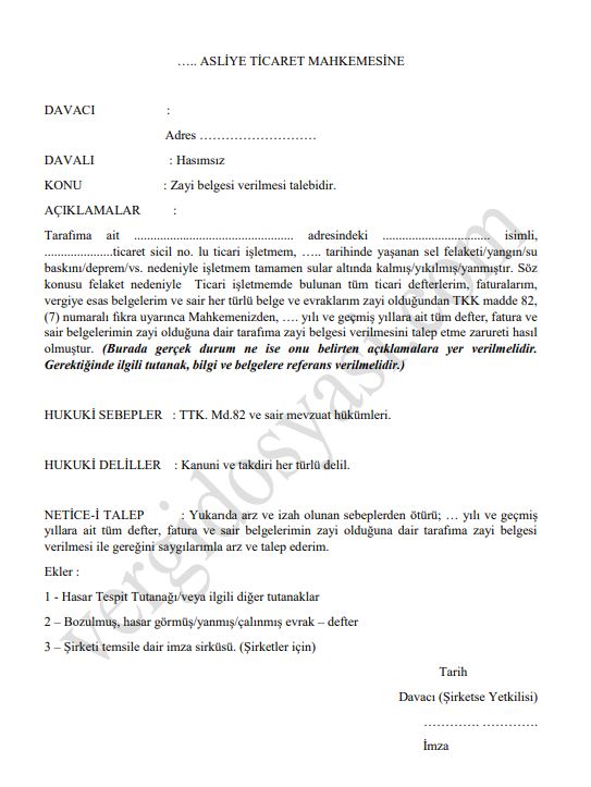 6102 sayılı Türk Ticaret Kanunu 82 nci maddesinin (7) numaralı fıkrasında bir tacirin saklamakla yükümlü olduğu defterler ve belgeler; yangın, su baskını veya yer sarsıntısı gibi bir afet veya hırsızlık sebebiyle ve kanuni saklama süresi içinde zıyaa uğrarsa tacir zıyaı öğrendiği tarihten itibaren onbeş gün içinde ticari işletmesinin bulunduğu yer yetkili mahkemesinden kendisine bir belge verilmesini isteyebileceği hüküm altın alınmıştır. Bu dava hasımsız açılmaktadır. Mahkeme gerekli gördüğü delillerin toplanmasını da emredebimektedir.