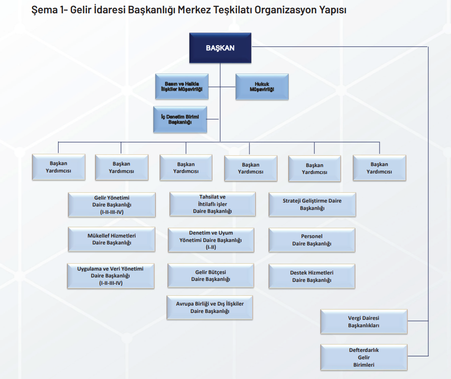 2024 Yılı itibariyle Gelir İdaresi Başkanlığının (GİB) organizasyon yapısını gösteren teşkilat şeması aşağıdaki gibidir: