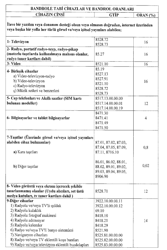 Yukarıdaki listede görüleceği ile görsel ve işitsel yayın alabilen cihazlar ile bu cihazları bünyesinde barındıran diğer tüm cihazlar bandrola tabi kılınmıştır.