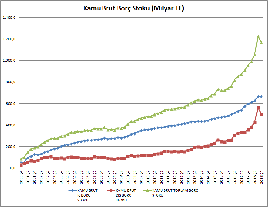 Kamu brüt iç ve dış borç stoku rakamları ile kamu brüt toplam borç stoku rakamları 2000-2018 dönemi kapsayacak şekilde aşağıdaki tabloda gösterilmiştir.