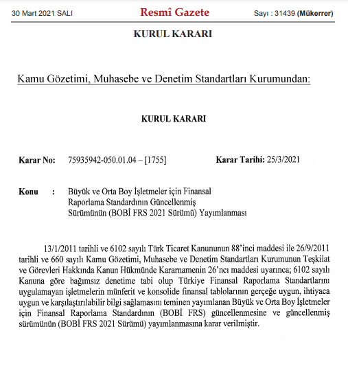 Büyük ve Orta Boy İşletmeler için Finansal Raporlama Standartlarının 2021 sürümü 30 Mart 2021 tarihli mükerrer Resmi Gazetede yayımlandı.