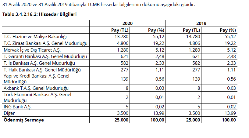 2020 yıl sonu itibarıyla, Merkez Bankası sermayesinin;