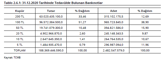 31.12.2020 itibariyle tedavülde bulunan 200 TL, 100 TL, 50 TL, 20 TL, 10 TL, 5 TL banknotlardan kaç adet bulunduğu, bunların toplam içindeki büyüklüğü aşağıdaki tabloda sunulmuştur.