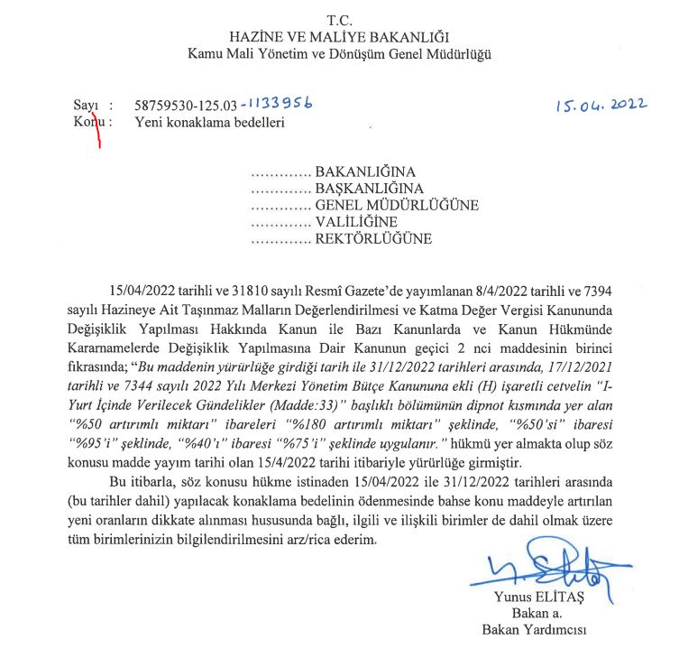15/04/2022 ile 31/12/2022 tarihleri arasında (bu tarihler dahil) kamu personelinin geçici görevlendirilmesinde yapılacak konaklama bedeli ödemelerine ilişkin Genel Yazı yayımlandı.