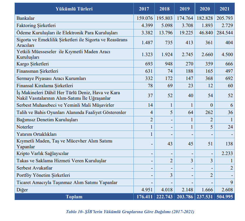 MASAK’a yapılan şüpheli işlem ve diğer bildirim sayıları. ŞİB Sayılarının Aklama ve Terörün Finansmanı Açısından DağılımıŞüpheli İşlem Bildirimlerinin Yükümlü Grupları İtibariyle Dağılımı