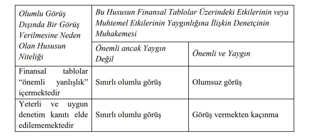 Bağımsız denetim çalışmaları sonucunda düzenlenen raporda “olumlu görüş” dışında bir görüş verilmesi durumunda bu görüşe dayanak teşkil eden hususlar ve görüşün dayanağı aşağıdaki tabloda sunulmuştur. Denetçinin olumlu görüş dışında bir görüş vermesine neden olan hususa ilişkin yaptığı muhakemenin ve söz konusu hususun finansal tablolar üzerindeki etkilerinin veya muhtemel etkilerinin yaygınlığının, verilecek görüş türünü etkilemesi söz konusudur.