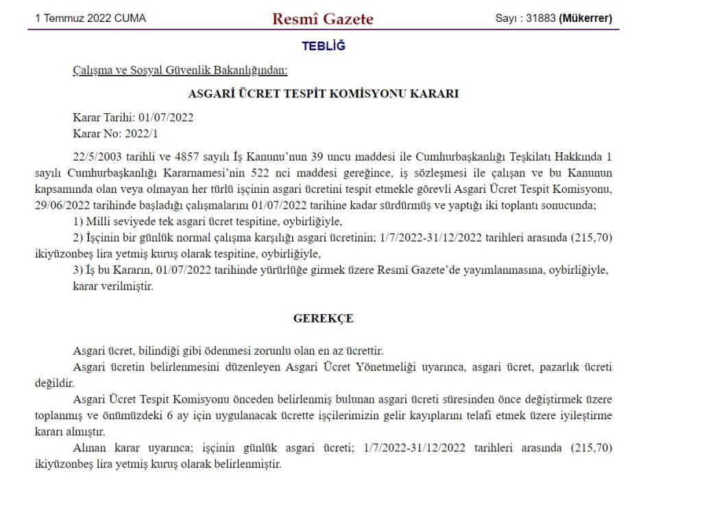 1 Temmuz 2022 tarih ve 31883 (Mükerrer) sayılı Resmi Gazetede yayımlanan Asgari Ücret Tespit Komisyonu Kararı ile işçinin bir günlük normal çalışma karşılığı asgari ücreti; 1/7/2022-31/12/2022 tarihleri arasında (215,70) ikiyüzonbeş lira yetmiş kuruş olarak tespit edilmiştir. Bu karar sonrasında 1 Temmuz 2022 ila 31 Aralık 2022 tarihleri arasında uygulanacak yeni asgari ücret ve sigorta primine esas kazanç tutarına ilişkin kalemler aşağıdaki gibi olmuştur: