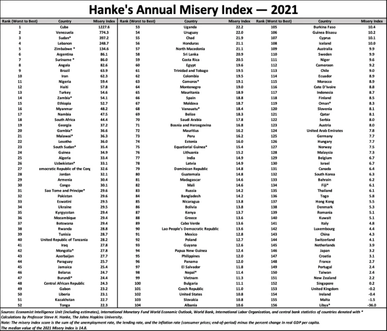 Hanke’s Yıllık Sefalet Endeksinde dikkate alınan faktörler, yıllık enflasyon oranı, yıllık işsizlik oranı, banka kredi faiz oranları ve GSYH değişimidir.