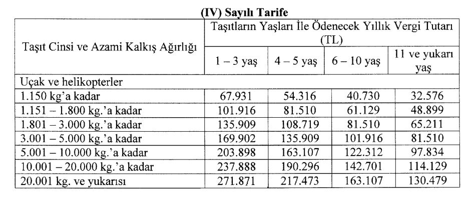 Uçak ve helikopterler (Türkkuşu, Türk Hava Kurumuna ait olanlar hariç) aşağıdaki (IV) sayılı tarifeye göre vergilendirilir.