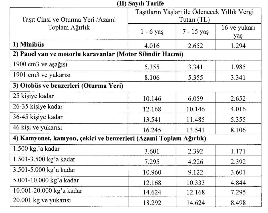 (I) ve (I/A) sayılı tarifelerde yazılı otomobil, arazi taşıtı, kaptıkaçtı ve benzerleri ile motosikletler dışında kalan motorlu kara taşıtları, aşağıdaki (II) sayılı tarifeye göre vergilendirilir.