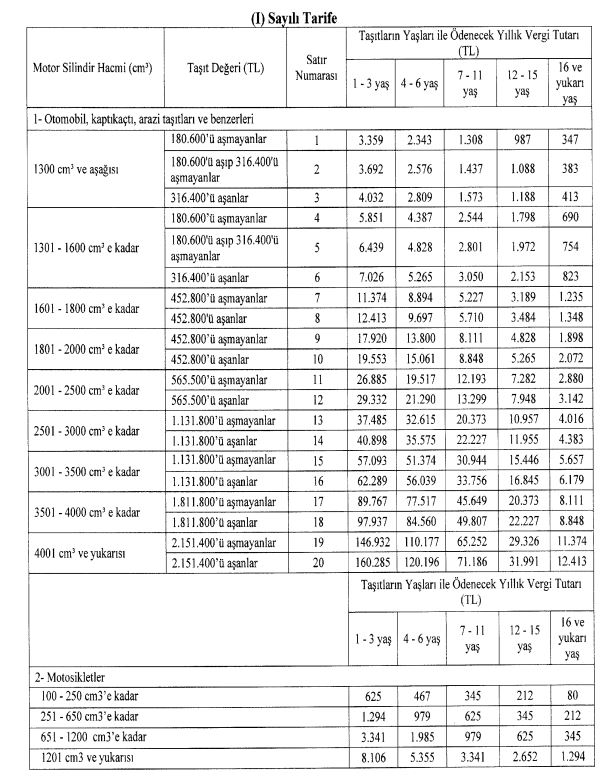 1/1/2018 tarihinden (bu tarih dahil) sonra kayıt ve tescil edilen otomobil, kaptıkaçtı, arazi taşıtları ve benzeri taşıtlar ile motosikletler aşağıdaki (I) sayılı tarifeye göre vergilendirilir